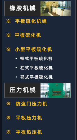 本公司生產的橡膠平板硫化機組,具有設計合理,制造精細、操作簡單、維修方便、生產效率高等特點。特別是PLC程序控制硫化機更具有現代自動控制等特色……